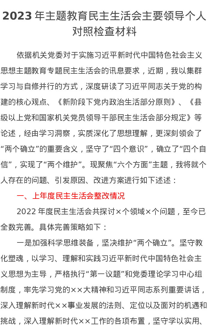 2023年第二批主题教育民主生活会主要领导个人对照检查材料(特色社会主义思想)