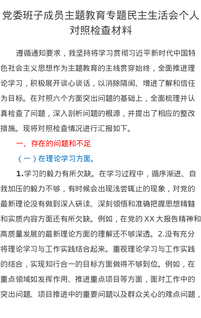 党委班子成员第二批主题教育专题民主生活会个人对照检查材料(特色社会主义思想)