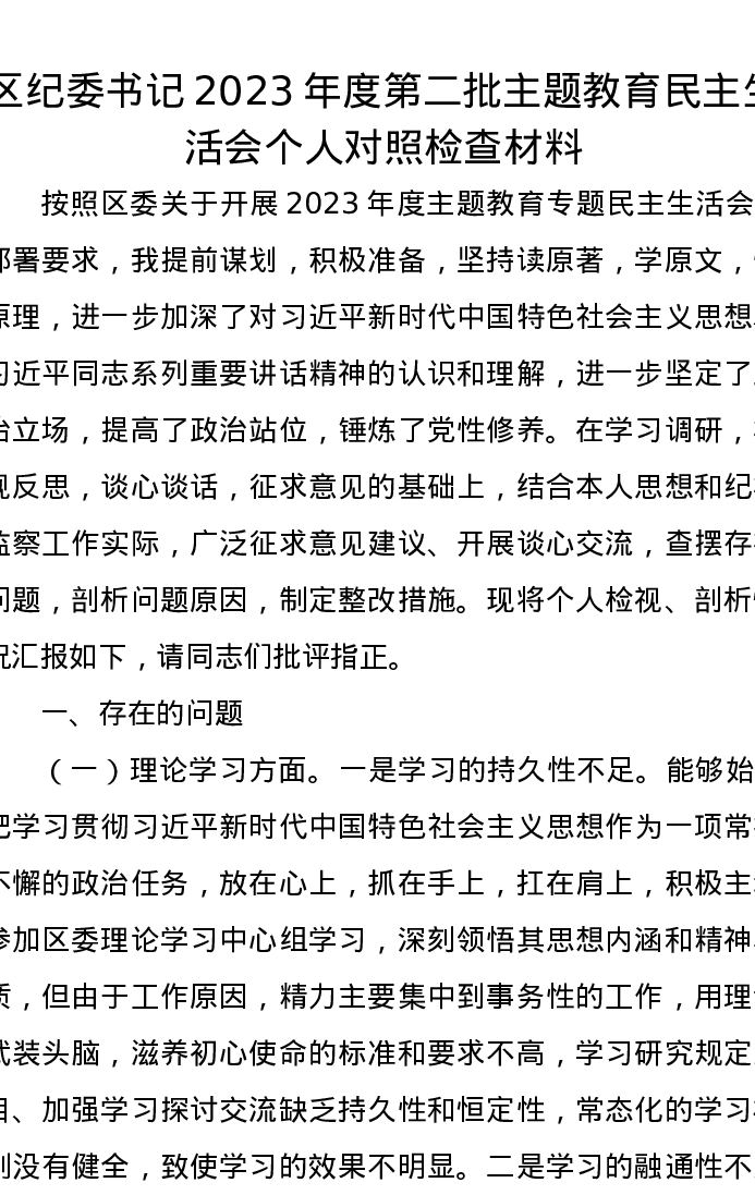 区纪委书记2023年度第二批主题教育民主生活会个人对照检查材料(特色社会主义思想)