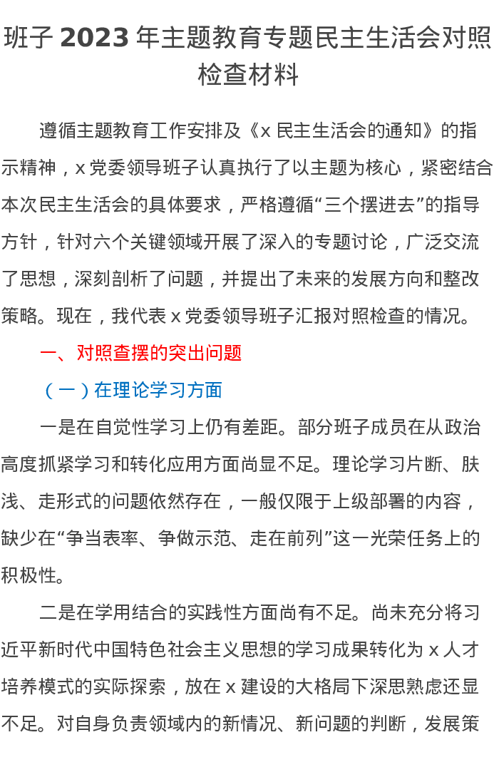 班子2023年第二批主题教育专题民主生活会对照检查材料2(特色社会主义思想)