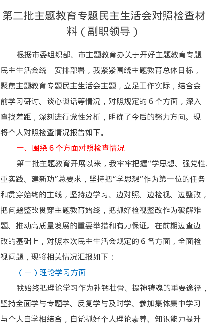 第二批主题教育专题民主生活会对照检查材料(副职领导)(特色社会主义思想)