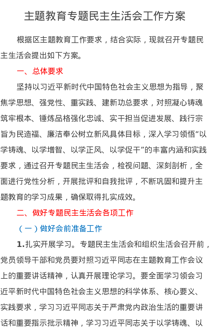 第二批主题教育专题民主生活会工作方案(特色社会主义思想)