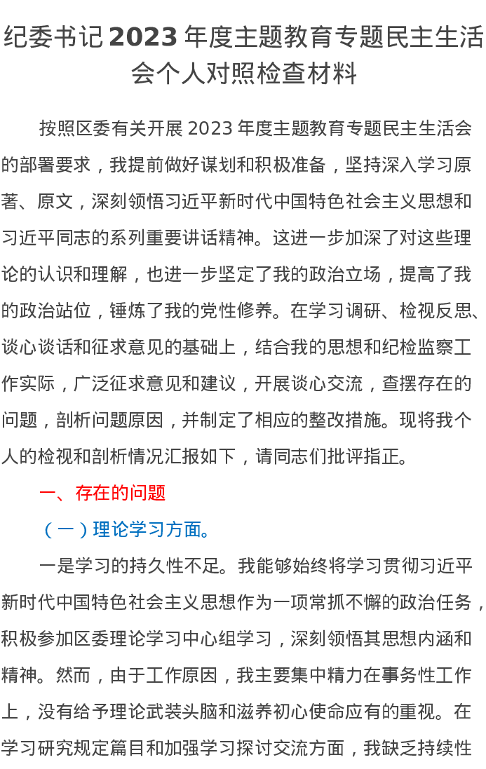 纪委书记2023年度第二批主题教育专题民主生活会个人对照检查材料(特色社会主义思想)