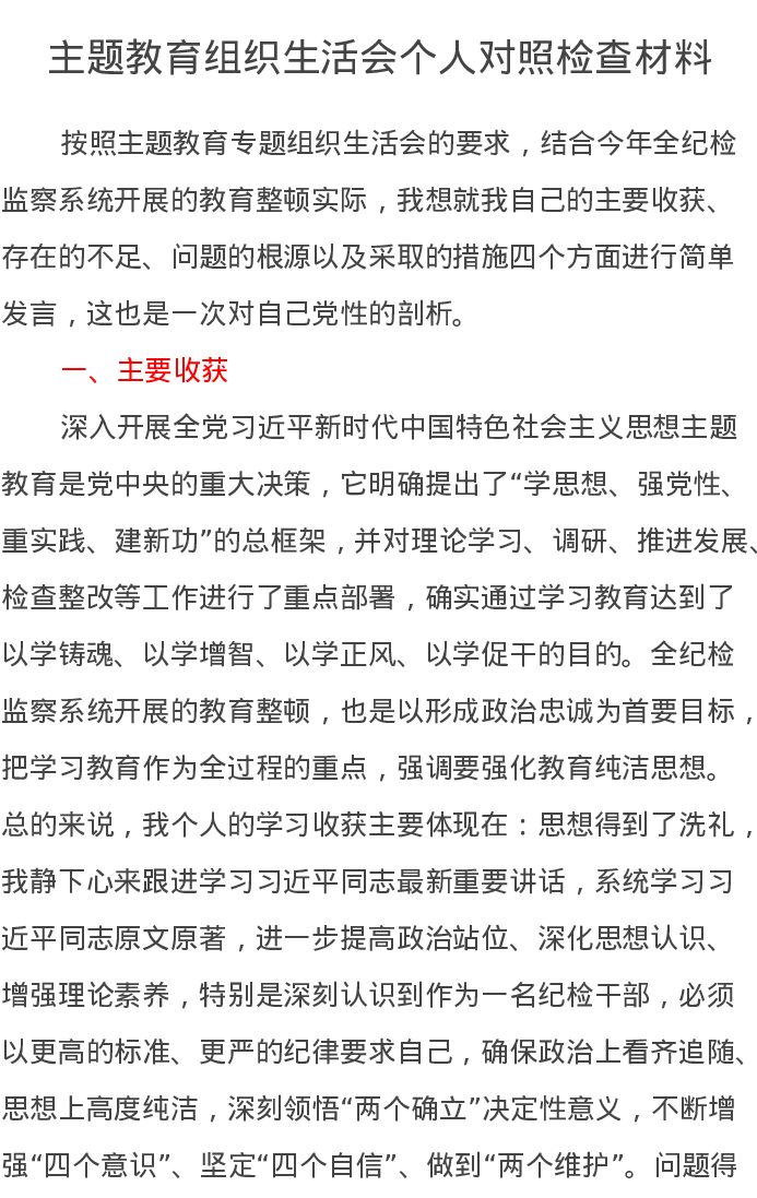 纪检干部教育整顿暨主题教育专题组织生活会对照检查材料(特色社会主义思想)