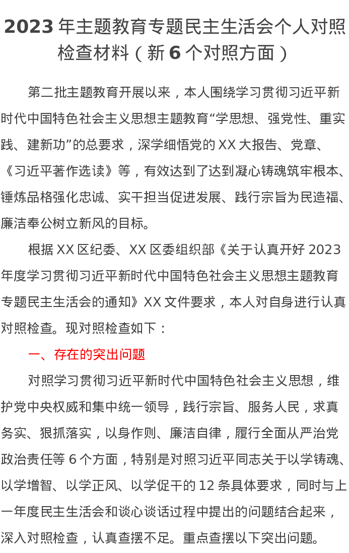 (新6个对照)2023年主题教育专题民主生活会个人对照检查材料
