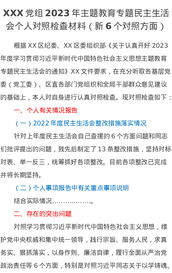(新6个对照)XXX党组2023年主题教育专题民主生活会个人对照检查材料特色社会主义思想