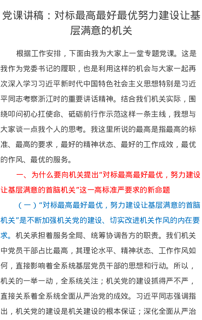 党课讲稿:对标最高最好最优努力建设让基层满意的机关