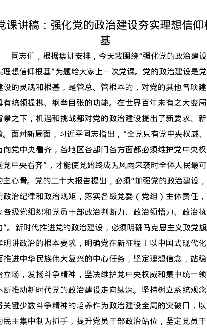 党课讲稿:强化党的政治建设夯实理想信仰根基