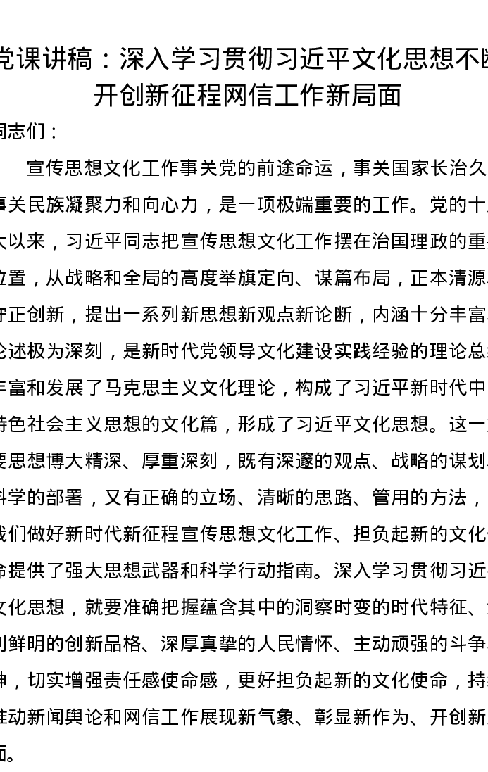 党课讲稿:深入学习贯彻习近平文化思想不断开创新征程网信工作新局面