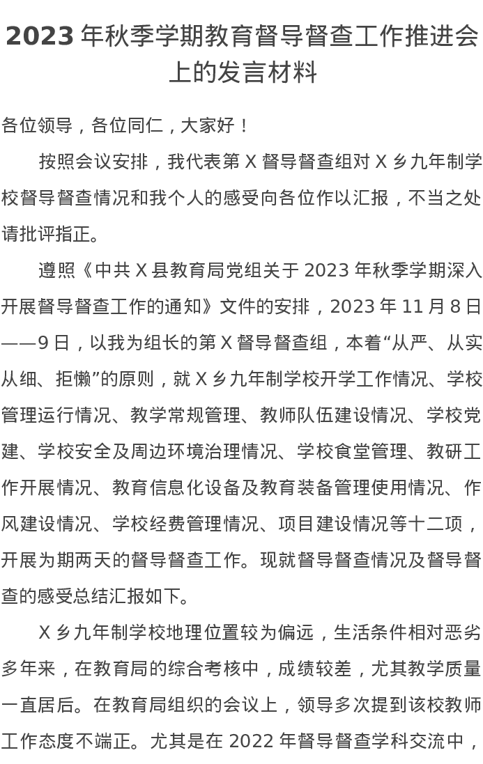 2023年秋季学期教育督导督查工作推进会上的发言材料