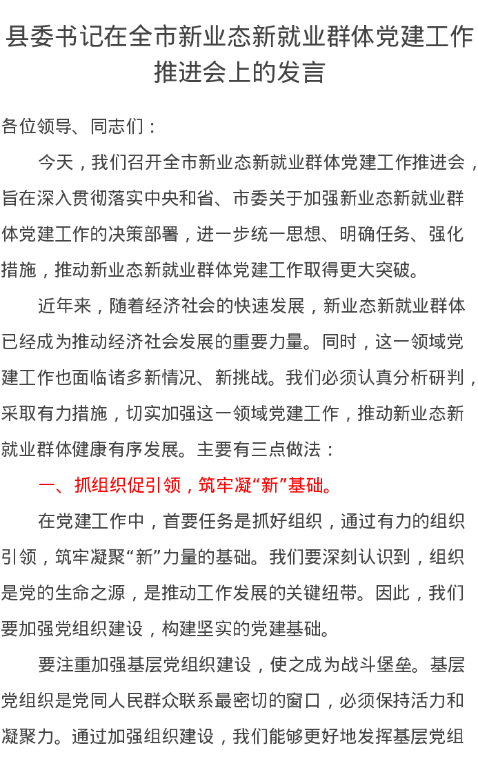 县委书记在全市新业态新就业群体党建工作推进会上的发言