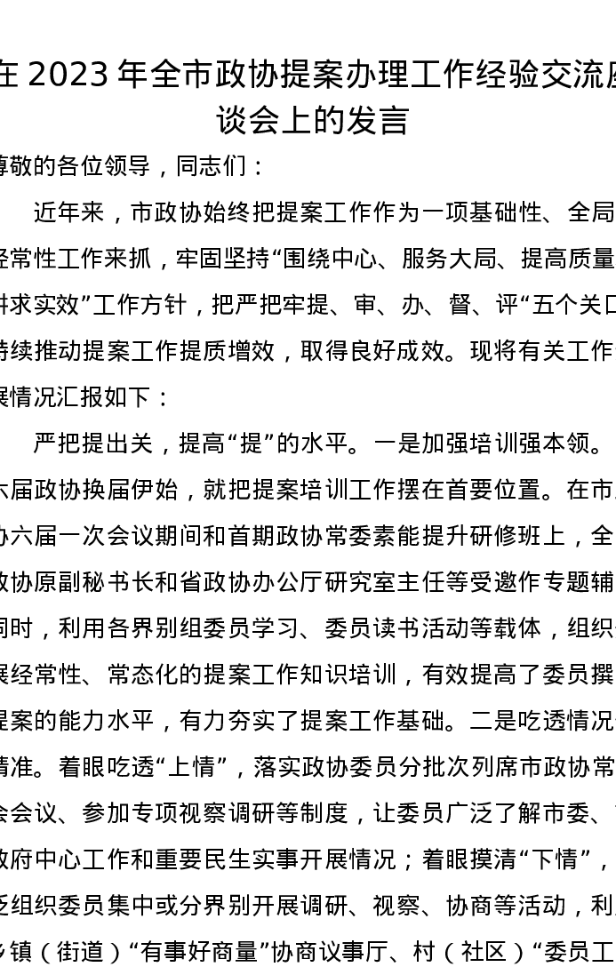在2023年全市政协提案办理工作经验交流座谈会上的发言