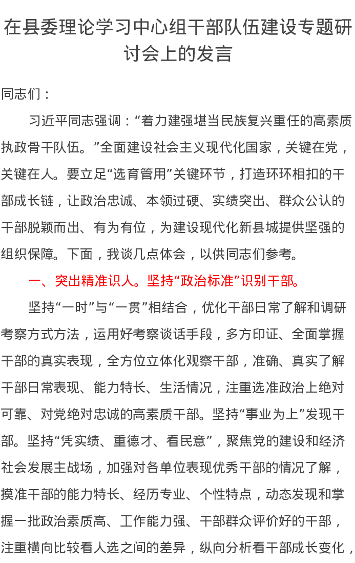 在县委理论学习中心组干部队伍建设专题研讨会上的发言