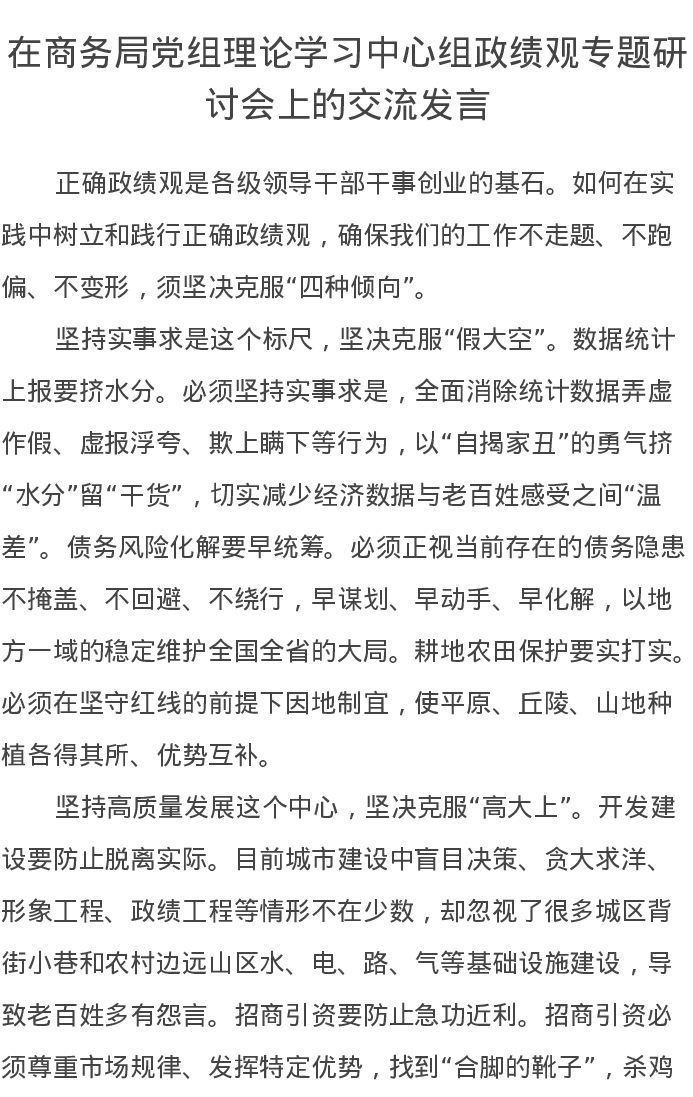 在商务局党组理论学习中心组政绩观专题研讨会上的交流发言