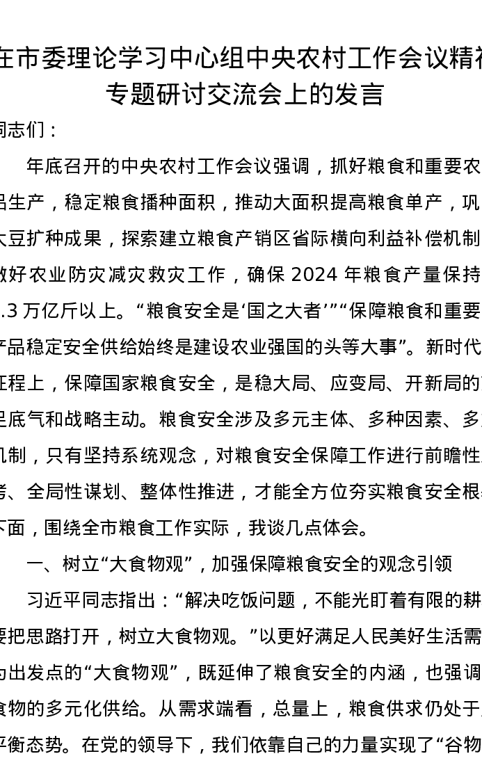 在市委理论学习中心组中央农村工作会议精神专题研讨交流会上的发言