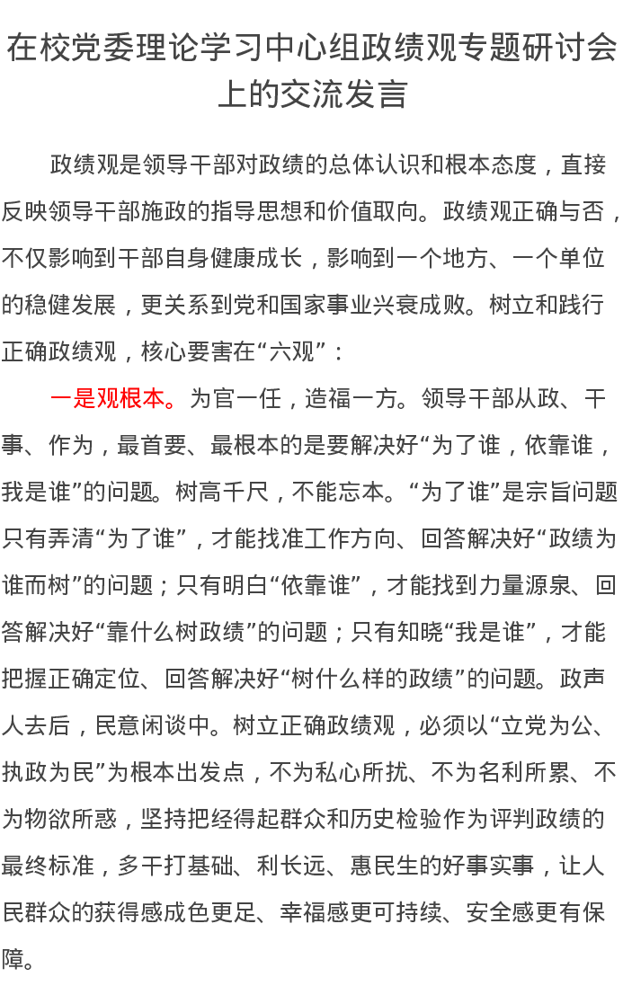 在校党委理论学习中心组政绩观专题研讨会上的交流发言