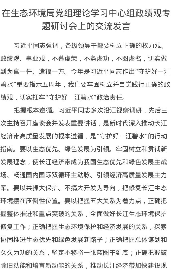 在生态环境局党组理论学习中心组政绩观专题研讨会上的交流发言