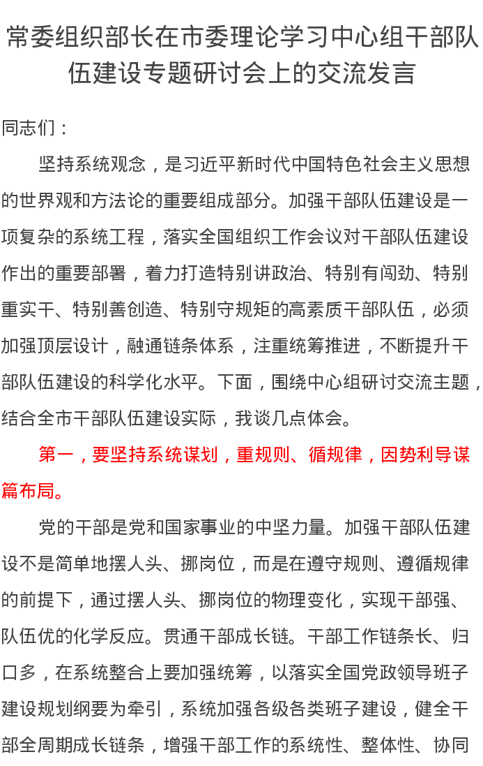 常委组织部长在市委理论学习中心组干部队伍建设专题研讨会上的交流发言