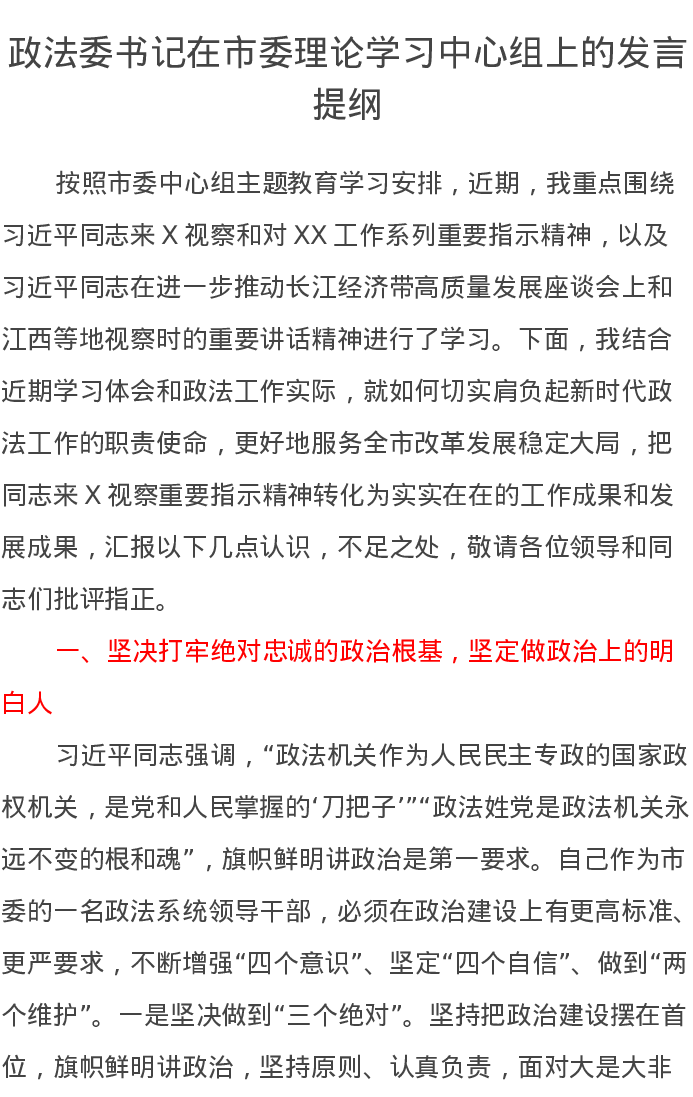 政法委书记在市委理论学习中心组上的发言提纲