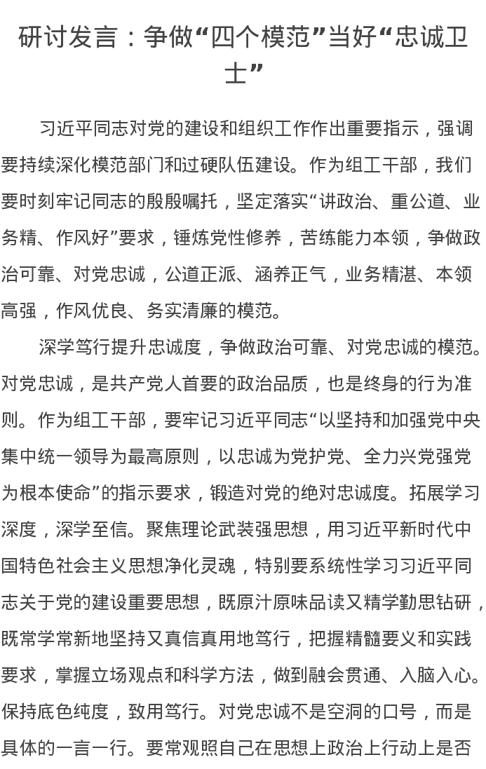 研讨发言:争做“四个模范”当好“忠诚卫士”