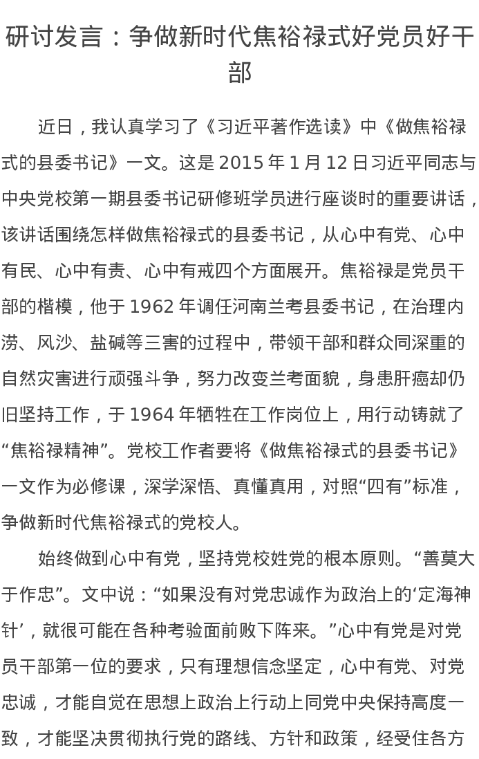 研讨发言:争做新时代焦裕禄式好党员好干部