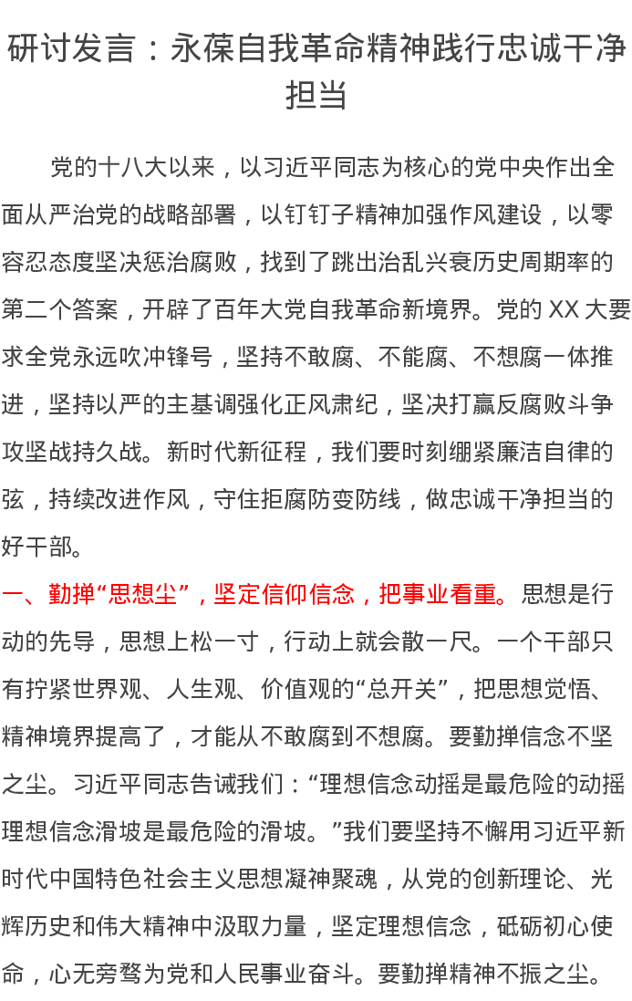研讨发言:永葆自我革命精神践行忠诚干净担当