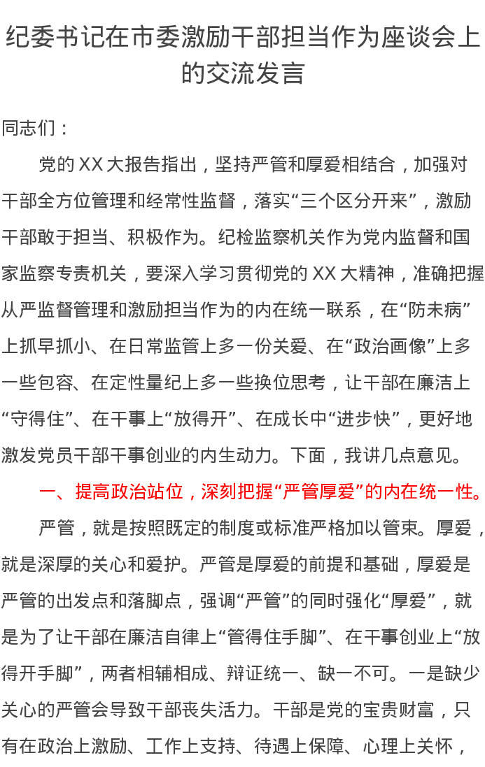 纪委书记在市委激励干部担当作为座谈会上的交流发言