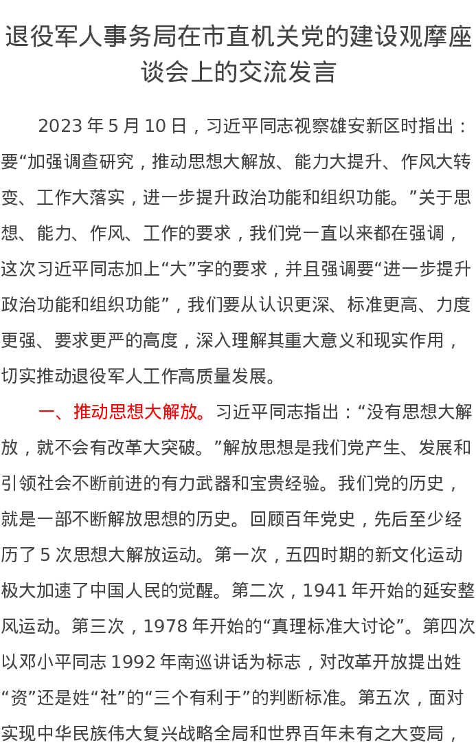 退役军人事务局在市直机关党的建设观摩座谈会上的交流发言