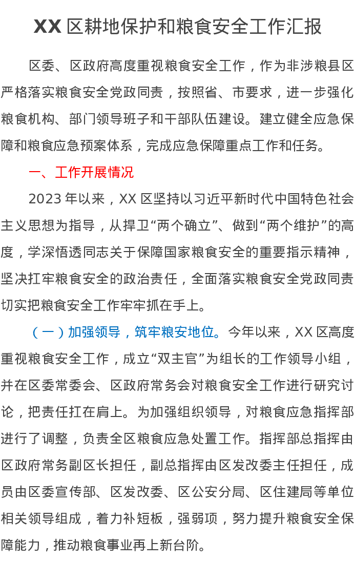 XX区耕地保护和粮食安全工作汇报
