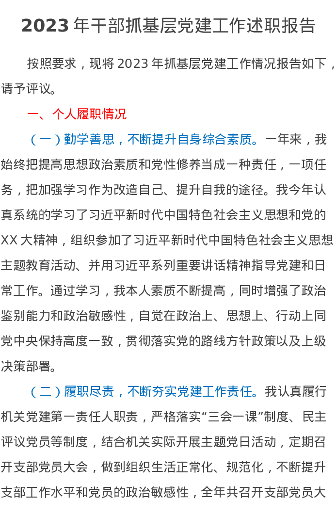 2023年干部抓基层党建工作述职报告
