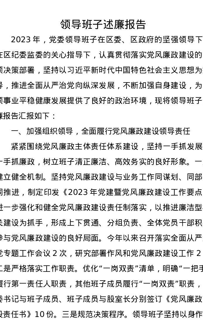 2023年领导班子述廉报告