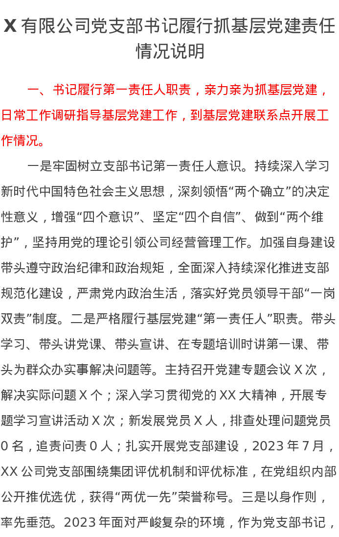 X有限公司党支部书记履行抓基层党建述职责任情况说明