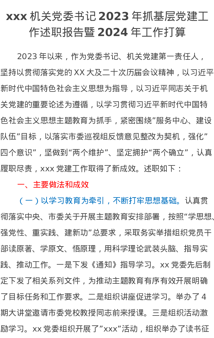 xxx机关党委书记2023年抓基层党建工作述职报告暨2024年工作打算