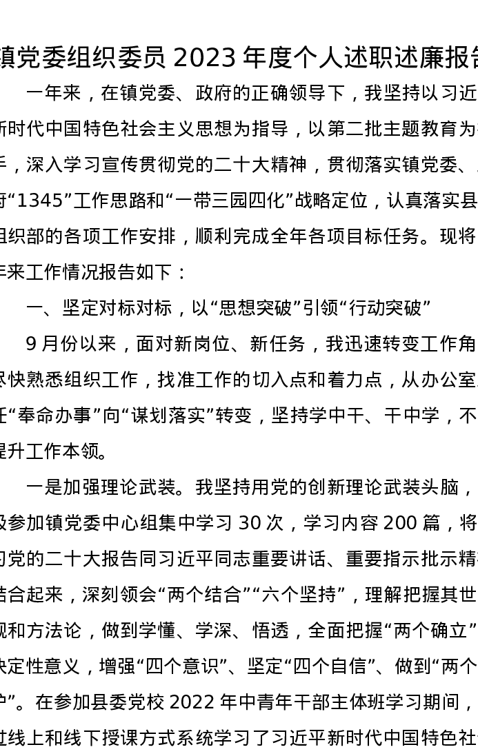 镇党委组织委员2023年度个人述职述廉报告