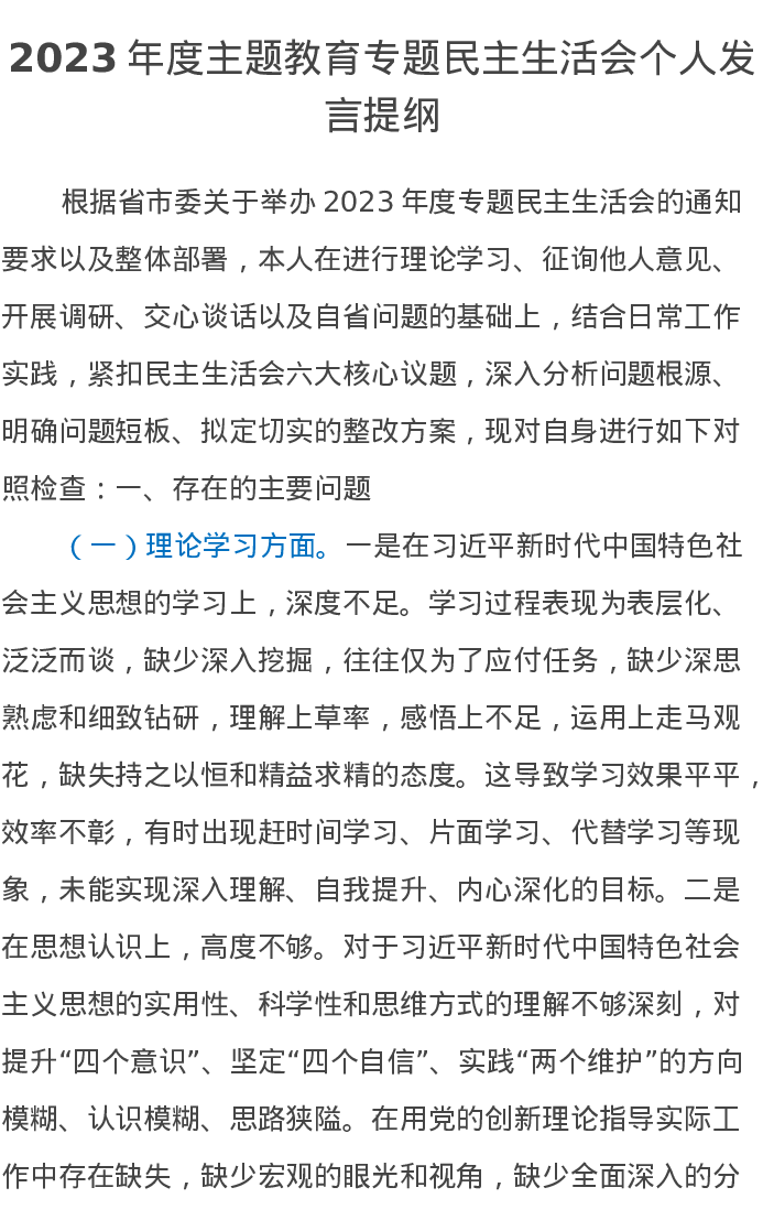2023年度第二批主题教育专题民主生活会个人发言提纲(特色社会主义思想)