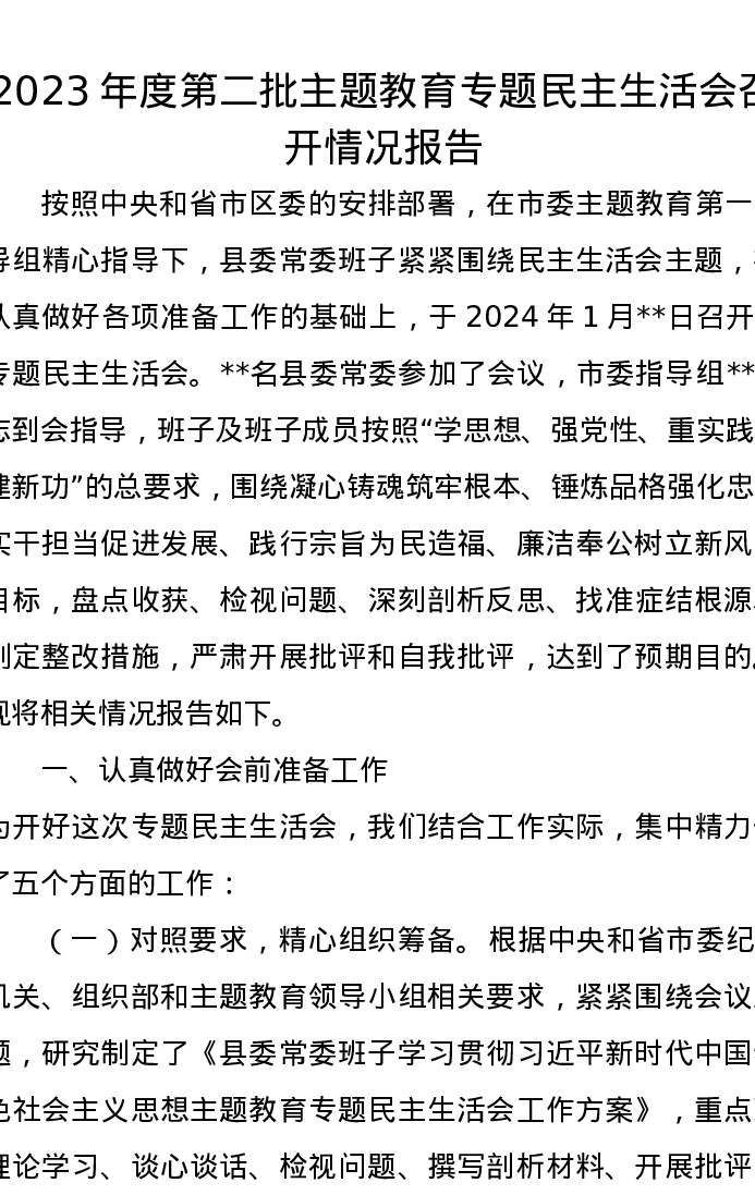 2023年度第二批主题教育专题民主生活会召开情况报告(特色社会主义思想)