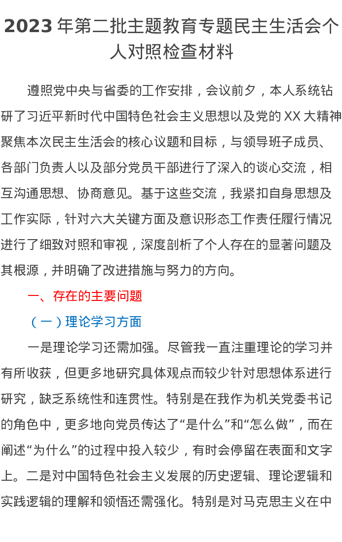 2023年第二批主题教育专题民主生活会个人对照检查材料