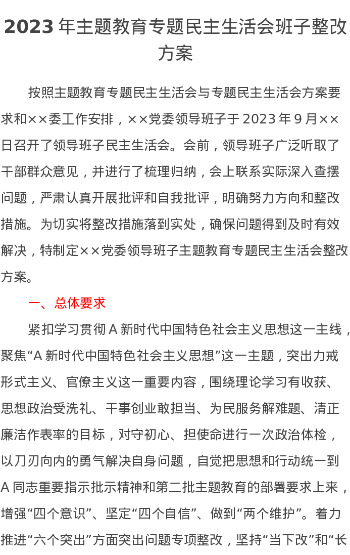 2023年第二批主题教育专题民主生活会班子整改方案(特色社会主义思想)