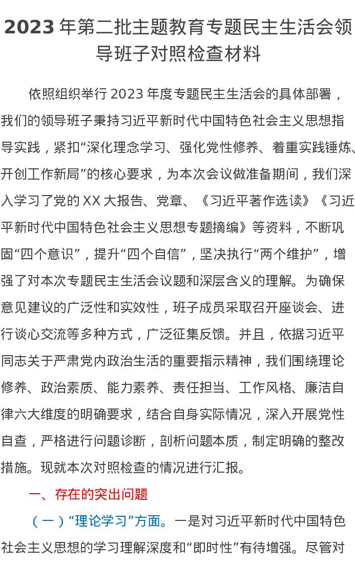 2023年第二批主题教育专题民主生活会领导班子对照检查材料