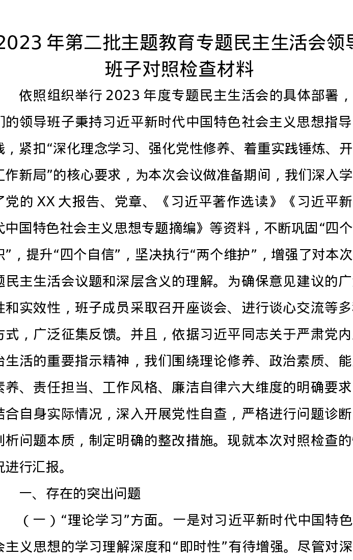2023年第二批主题教育专题民主生活会领导班子对照检查材料(特色社会主义思想)
