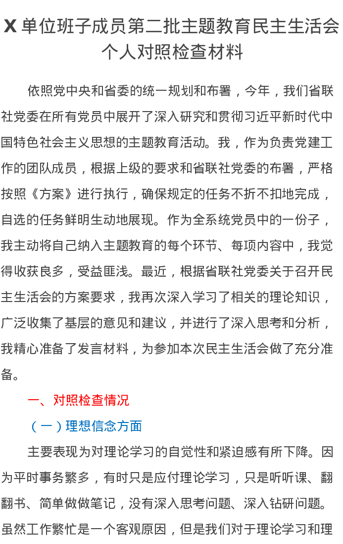 X单位班子成员第二批主题教育民主生活会个人对照检查材料(特色社会主义思想)