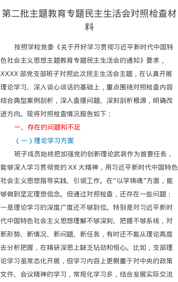 X学校党支部班子第二批主题教育专题民主生活会对照检查材料