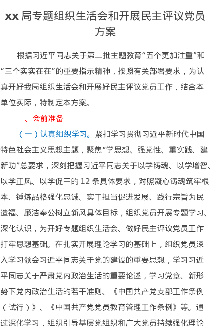 xx局第二批主题教育组织生活会和开展民主评议党员方案(特色社会主义思想)