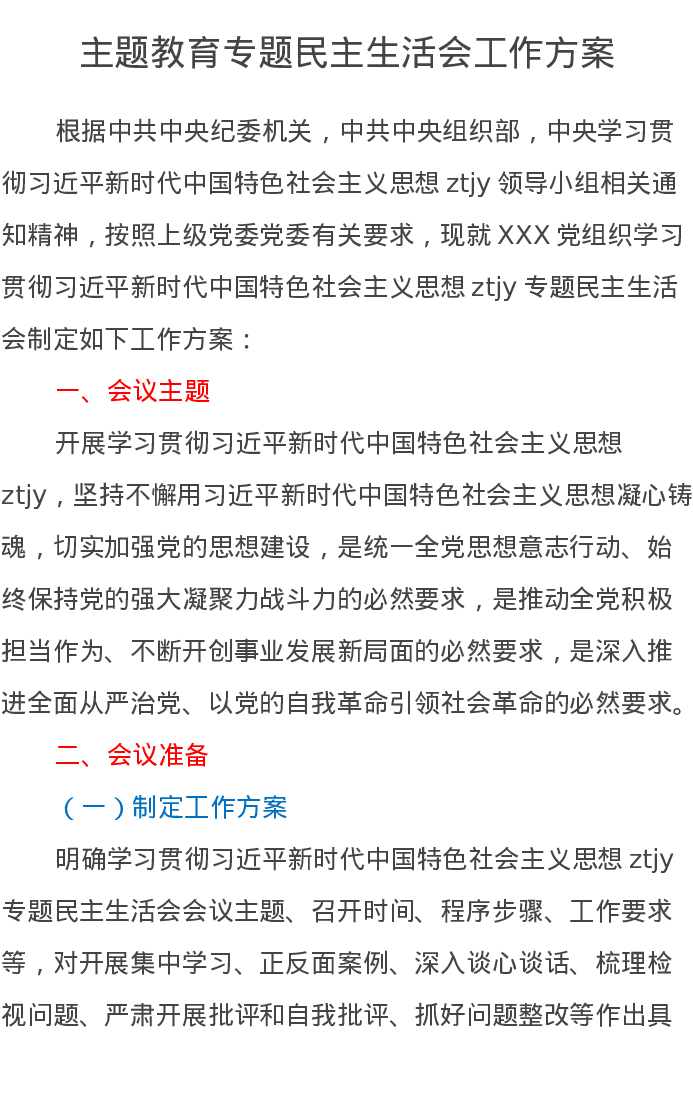 主题教育专题民主生活会工作方案(特色社会主义思想)