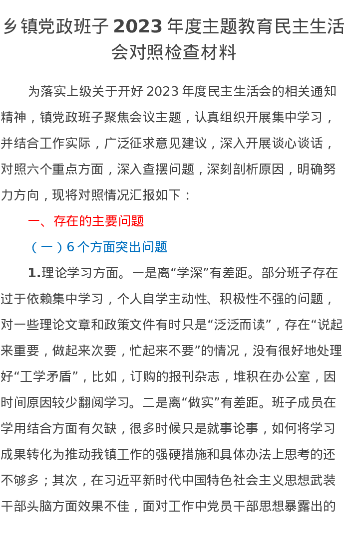 乡镇党政班子2023年度第二批主题教育民主生活会对照检查材料(特色社会主义思想)