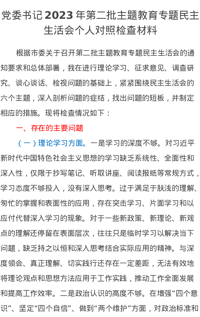 党委书记2023年第二批主题教育专题民主生活会个人对照检查材料(特色社会主义思想)