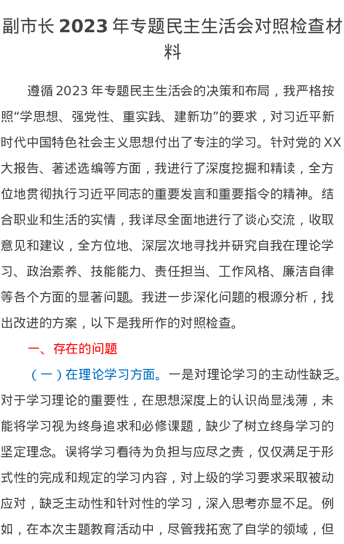 副市长2023年主题教育专题民主生活会对照检查材料(特色社会主义思想)