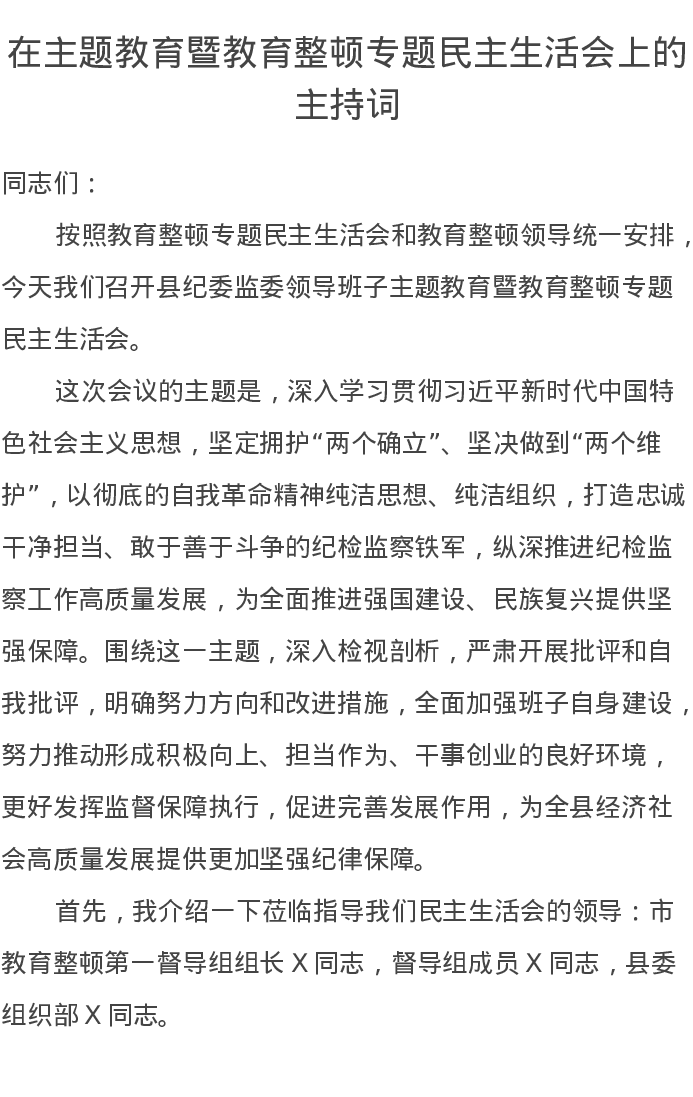 在主题教育暨教育整顿专题民主生活会上的主持词(特色社会主义思想)