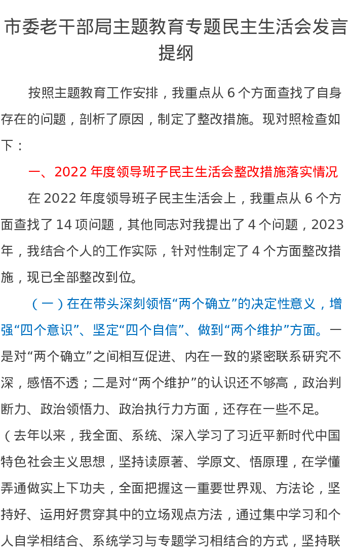 市委老干部局第二批主题教育专题民主生活会发言提纲(特色社会主义思想)