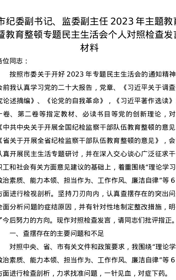 市纪委副书记、监委副主任2023年主题教育暨教育整顿专题民主生活会个人对照检查发言材料